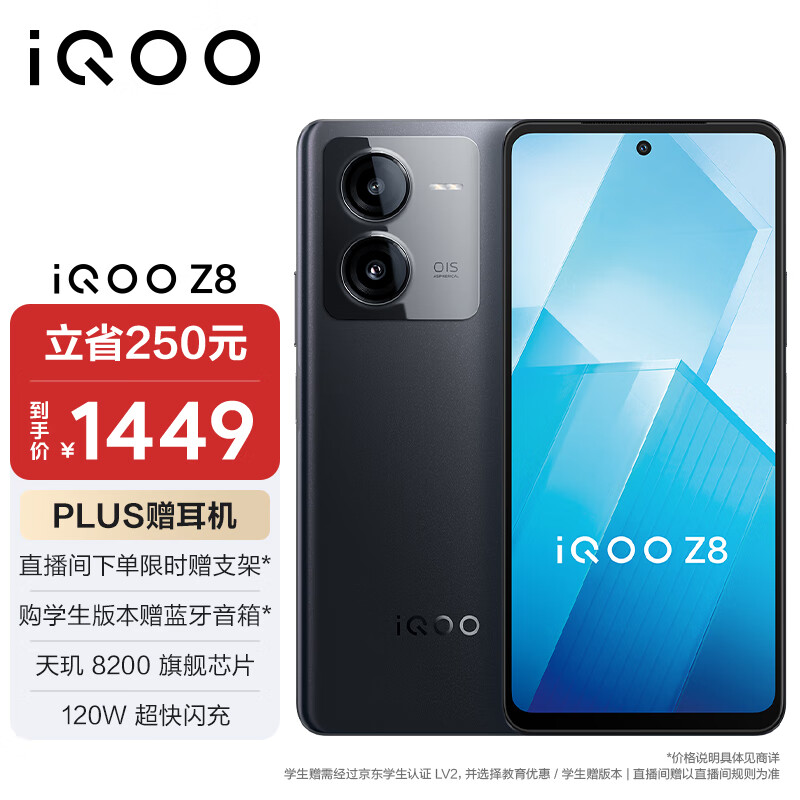 vivo iQOO Z8 8GB+256GB 曜夜黑 天玑 8200 120W超快闪充 5000mAh超长续航 5G手机价格:1699.00元!