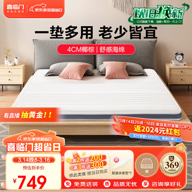 喜临门薄垫 4cm3D椰棕薄床垫 青少年老人偏硬床垫 伊菲6 2S 1.0x2.0米价格:749.00元!