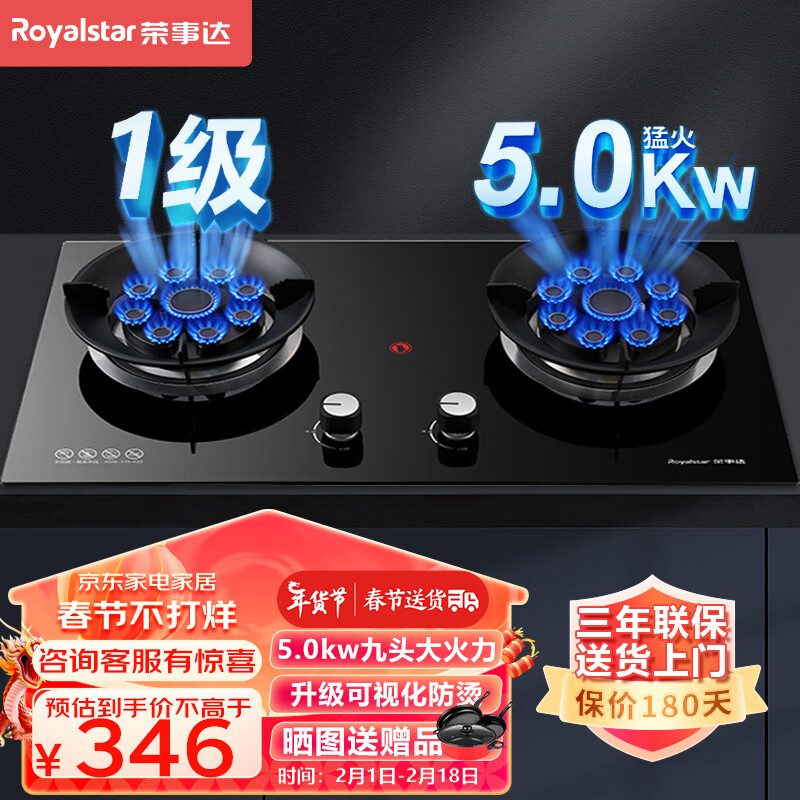 荣事达(Royalstar)燃气灶液化气双灶嵌入式家用5.0KW大火力双九头钢化玻璃熄火保护猛火灶具 RSD-R210 液化气价格:346.00元!