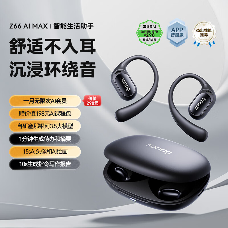 SANAG【高级舒适耳机】Z66蓝牙耳机挂耳式骨传导概念不入耳运动骑行降噪高端商务通用礼物 炫酷黑价格:399.00元!