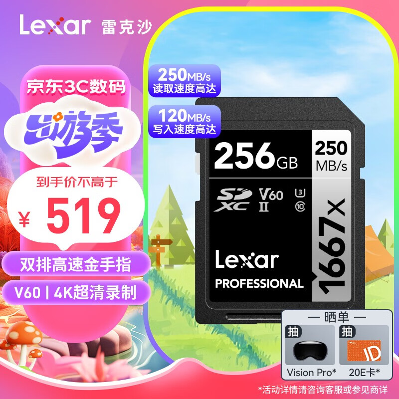 雷克沙(Lexar)256GB SD存储卡 U3 V60 4K数码相机内存卡 读250MB/s 写120MB/s 双排金手指(1667x Pro)价格:519.00元!