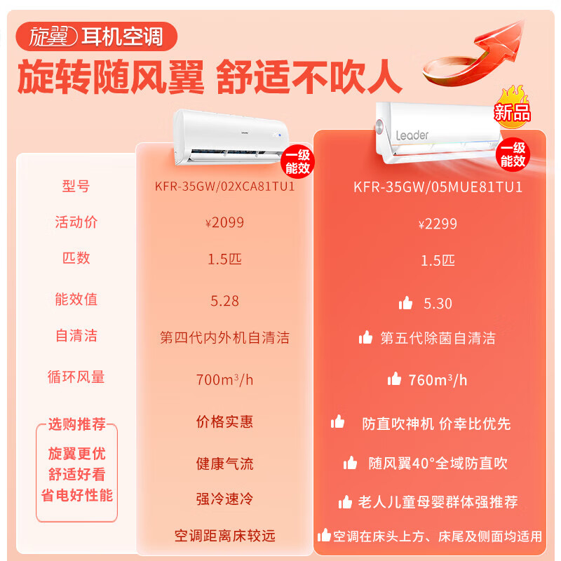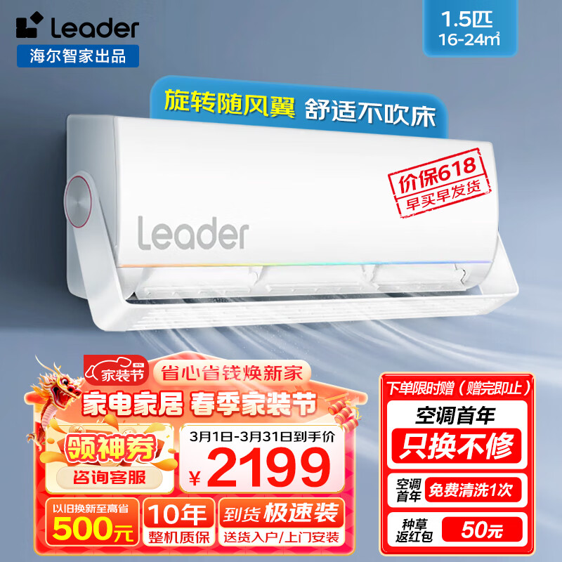Leader空调海尔智家出品 旋翼1.5匹 新一级变频空调挂机 自清洁挂式空调防直吹壁挂式 35MUE81以旧换新价格:2199.00元!
