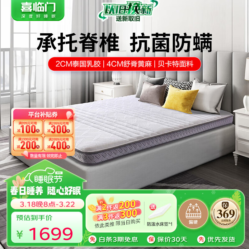 喜临门2cm进口乳胶薄垫子 黄麻硬垫 青少年/老人床垫air艾尔1.2x1.9米价格:2099.00元!