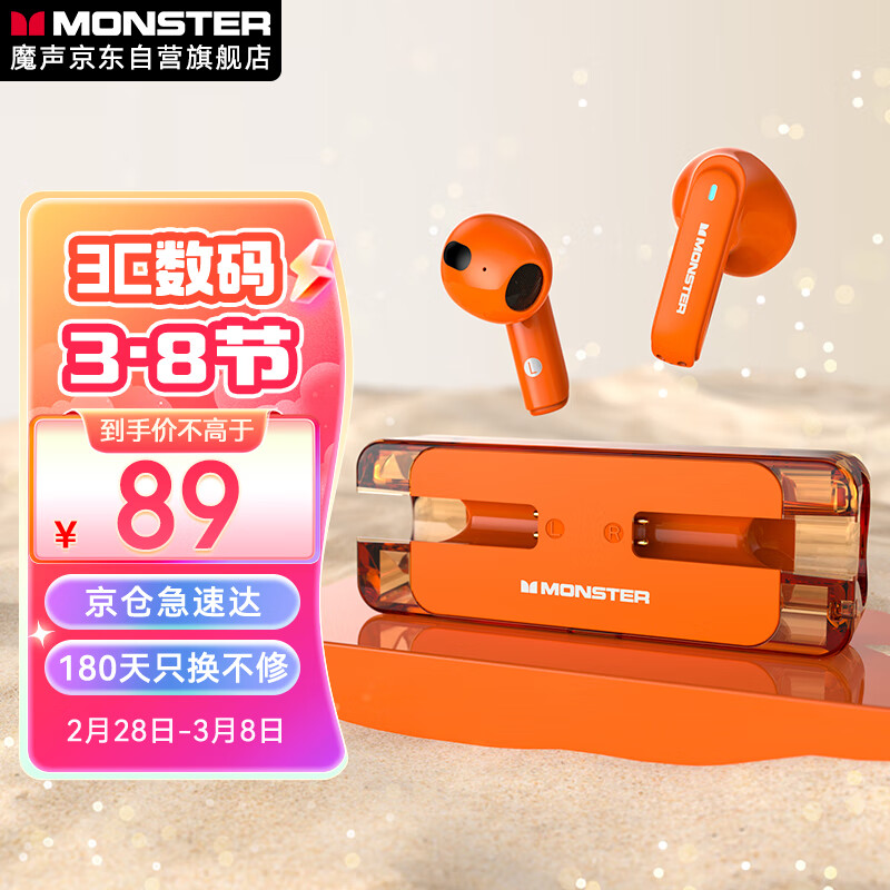 魔声(Monster) XKT08蓝牙耳机真无线智能降噪潮流外观半入耳式耳机通用华为苹果小米手机 橙色价格:119.00元!