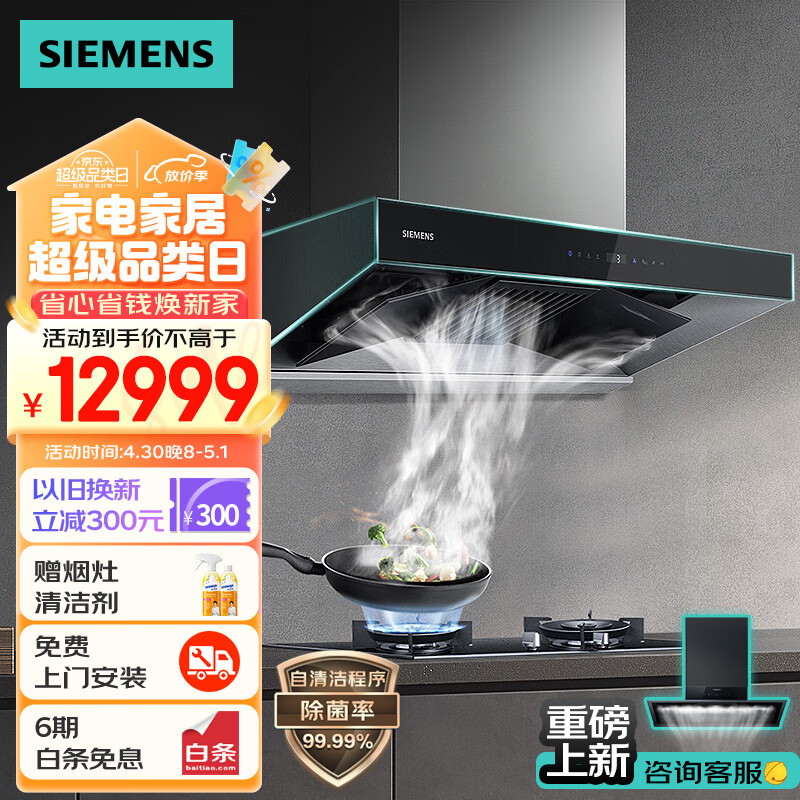 西门子(SIEMENS)油烟机燃气灶套餐欧式顶吸26m3/min智能展翼油烟机自清洁5.2kW灶 958W+231MP(天然气)价格:12999.00元!