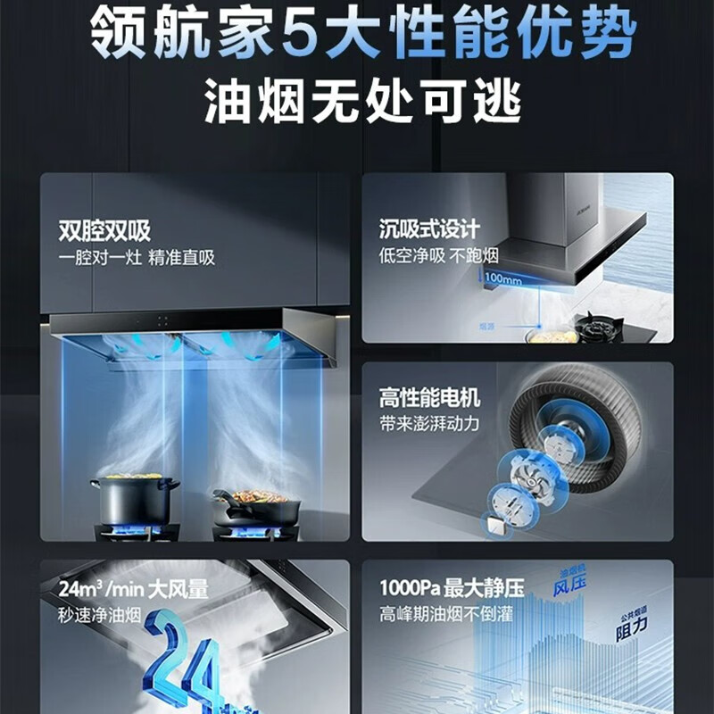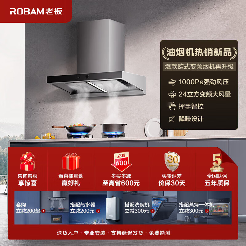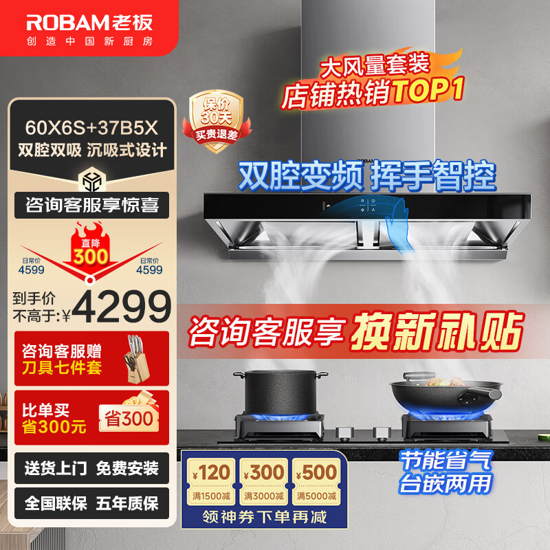 老板(Robam)【领航家】 抽油烟机燃气灶 双腔24风量大吸力 欧式新款静音变频免拆洗 60X6S+37B5X烟灶套装价格:4299.00元!