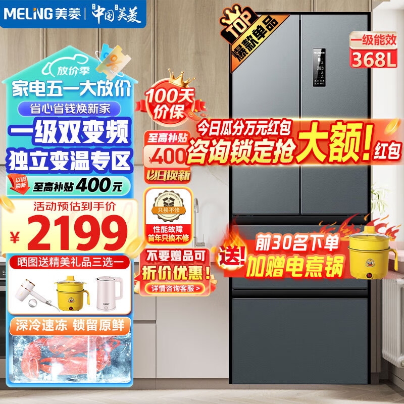 美菱(MeiLing)368升法式多门冰箱四开门一级能效双变频风冷无霜节能低音嵌入式家用大容量电冰箱 BCD-368WPC价格:2399.00元!