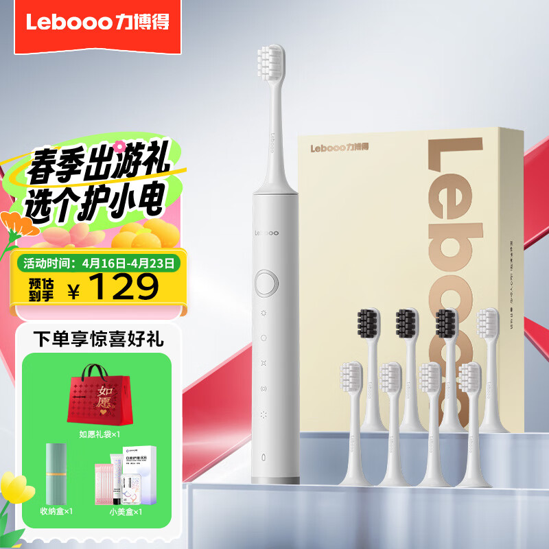 力博得(Lebooo)声波电动牙刷成人情侣家用节日生日礼物送男友送女友礼赠礼盒装 悦心2024款 8刷头(白色)价格:129.00元!