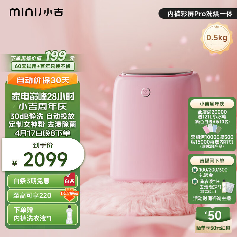 小吉(MINIJ)0.5kg内衣洗衣机小型洗烘一体变频内裤洗衣机粉色女神节礼物U10-PD pro价格:2099.00元!