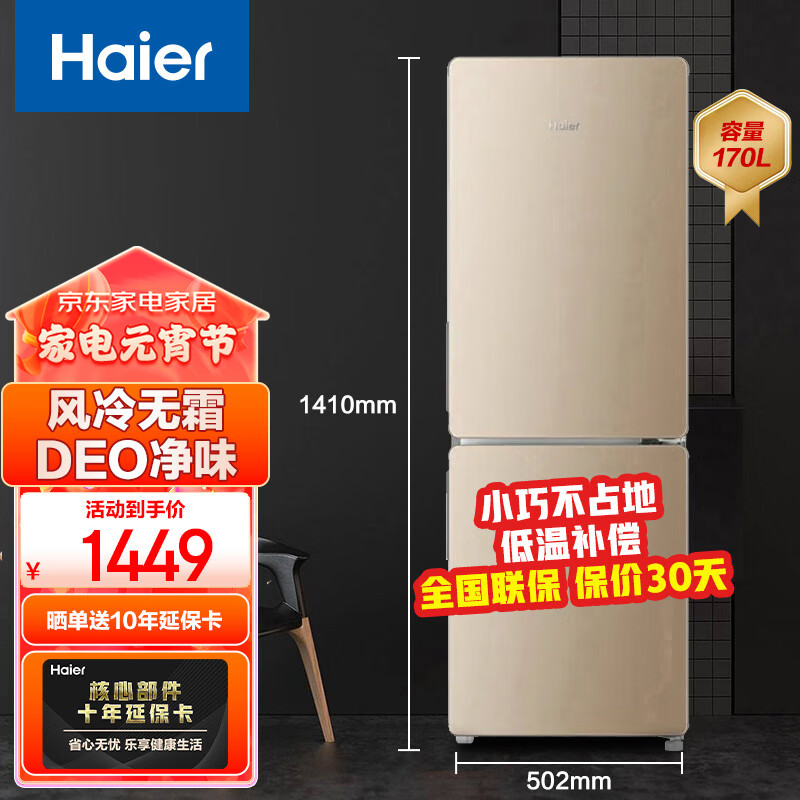海尔海尔冰箱小型双开门170升风冷无霜电冰箱两门家用迷你二门宿舍租房BCD-170WDPT[家电]价格:1449.00元!