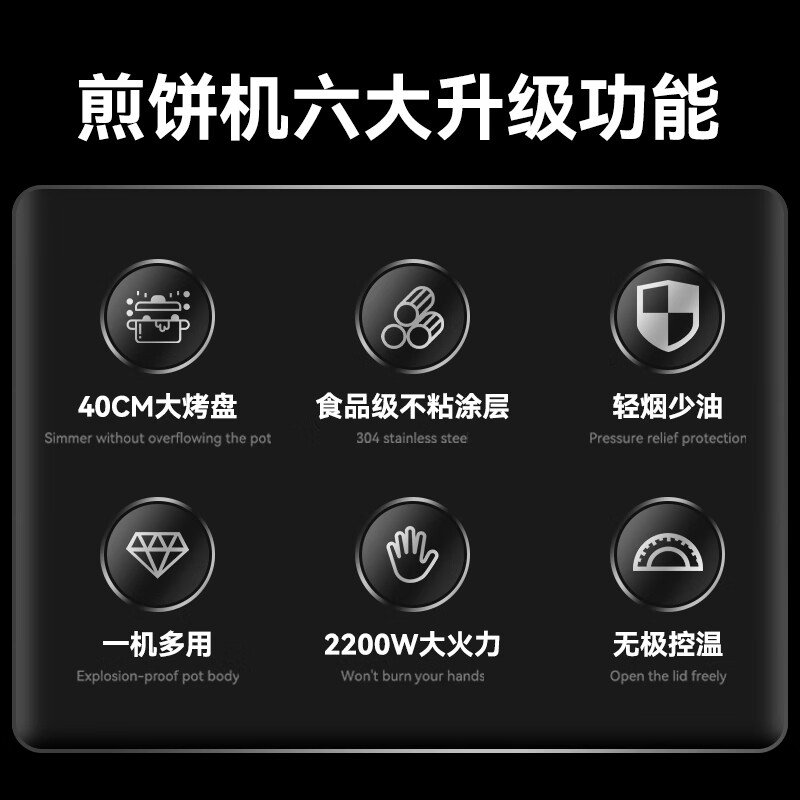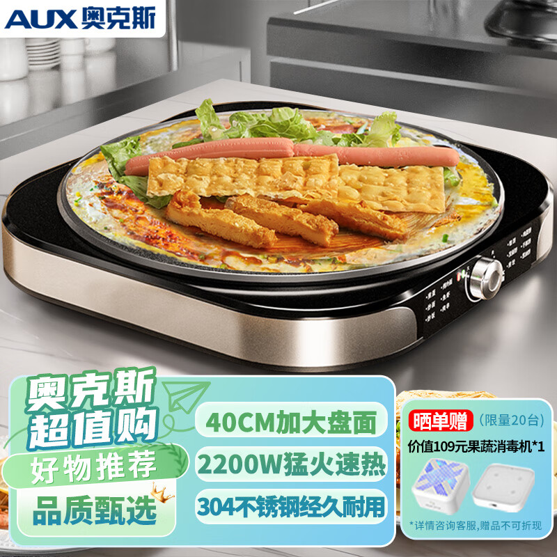 奥克斯(AUX)电饼铛商用不粘煎饼锅烙饼锅煎饼果子多功能煎烤机不锈钢40CM大尺寸大功率薄饼机 不锈钢机身价格:259.00元!
