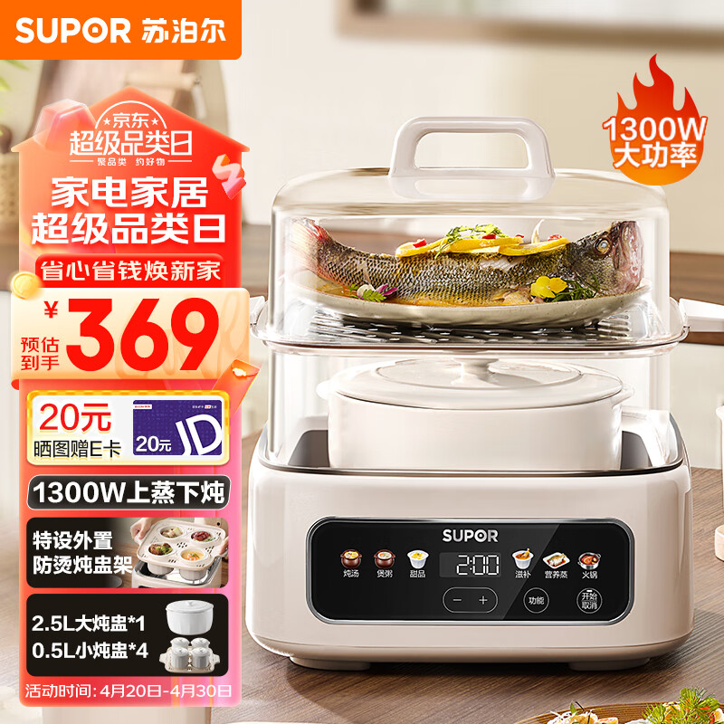 苏泊尔(SUPOR)电炖锅 电炖盅 隔水炖锅 家用煲汤锅电蒸锅17L上蒸下炖熬粥燕窝保温可预约炖汤锅 DZ20FC871价格:369.00元!
