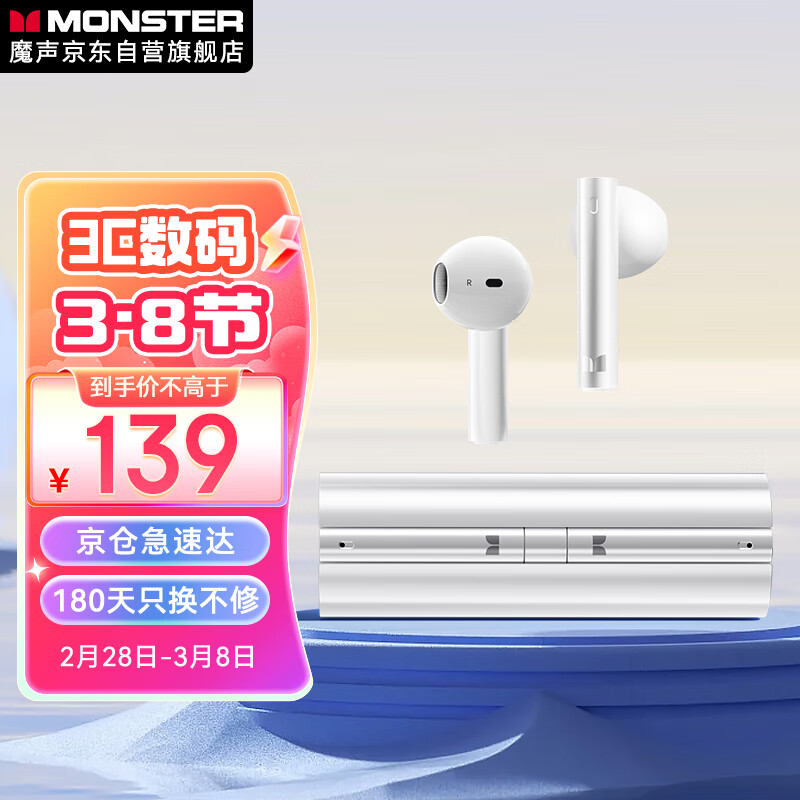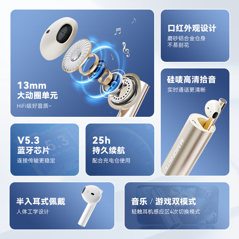 魔声(MONSTER)GT11 MK2真无线蓝牙耳机 蓝牙5.3 智能降噪跑步运动游戏音乐耳机 适用苹果华为小米手机价格:159.00元!