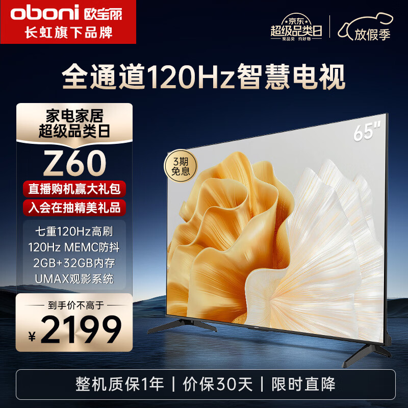 长虹欧宝丽65Z60 65英寸全通道120Hz高刷游戏电视 七大高刷场景 2+32GB 智能平板液晶电视机 以旧换新价格:2199.00元!