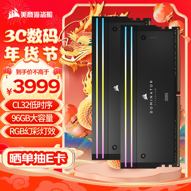 美商海盗船 (USCORSAIR) 96GB(48Gx2)套装 DDR5 6600 台式机内存条 统治者泰坦 RGB灯条 黑色 C32价格:3999.00元!