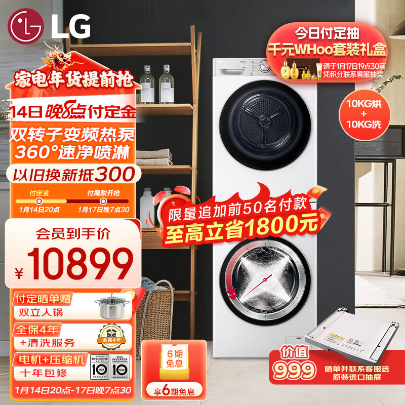 LG小旋风系列洗烘套装 10kg滚筒洗衣机全自动+10kg双转子变频热泵烘干机 FCW10Y4WA+RH10V9AV2WR 白价格:13399.00元!