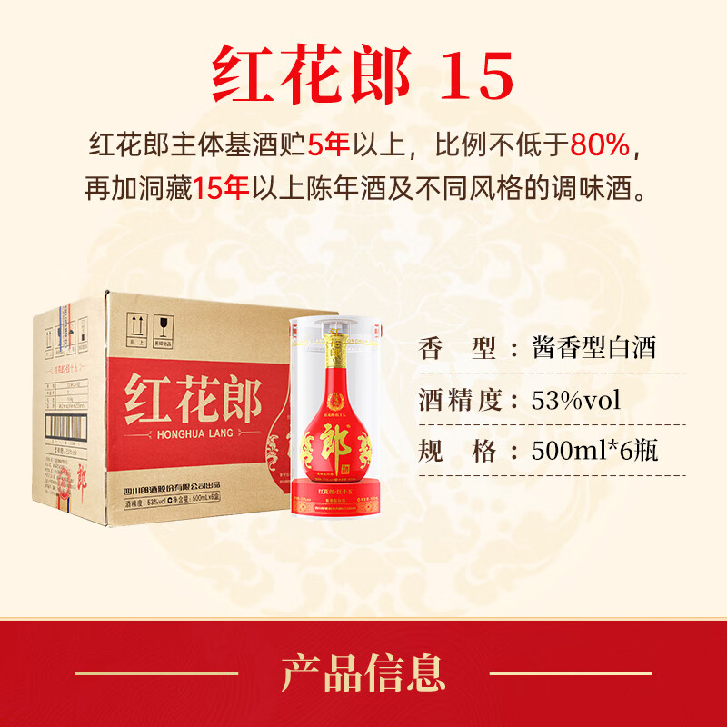 郎酒 红花郎15 酱香型白酒 53度 500ml*6瓶 整箱装价格:3208.00元!