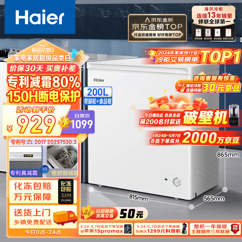 海尔(Haier)200升低霜小冰柜家用商用冷藏柜冷冻柜两用冰柜小型租房用小冰箱小型冷柜BC/BD-200GHDT以旧换新价格:969.00元!