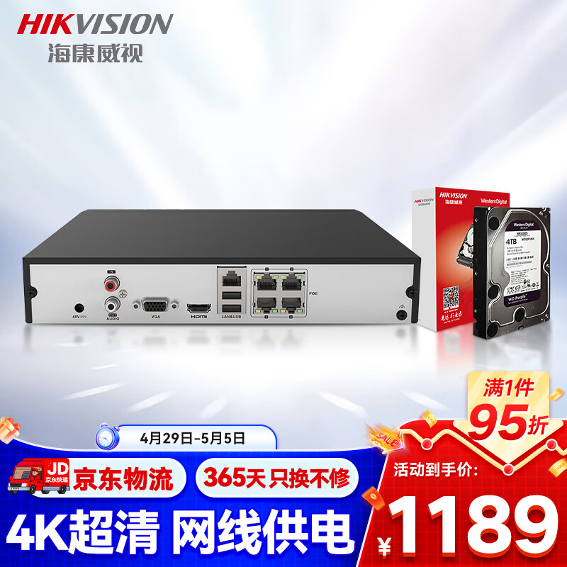 HIKVISION海康威视网络硬盘录像机监控4路POE网线供电NVR满配4个摄像头带4T硬盘DS-7804N-K1/4P价格:1284.00元!