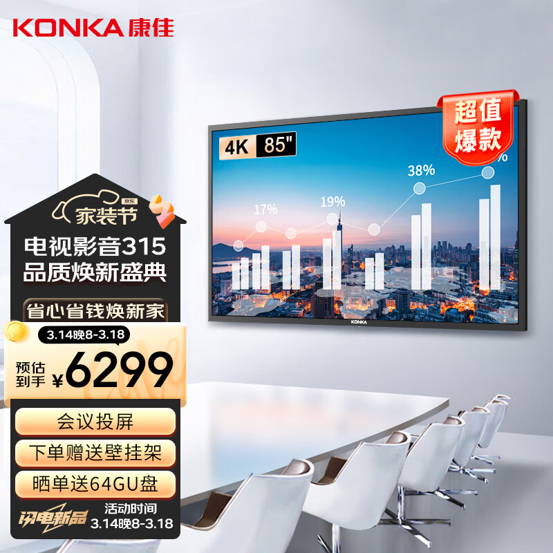 康佳(KONKA)85英寸会议电视办公平板一体机超大商用移动会议显示屏幕 投屏投影智慧屏 纯净会议UI价格:6299.00元!