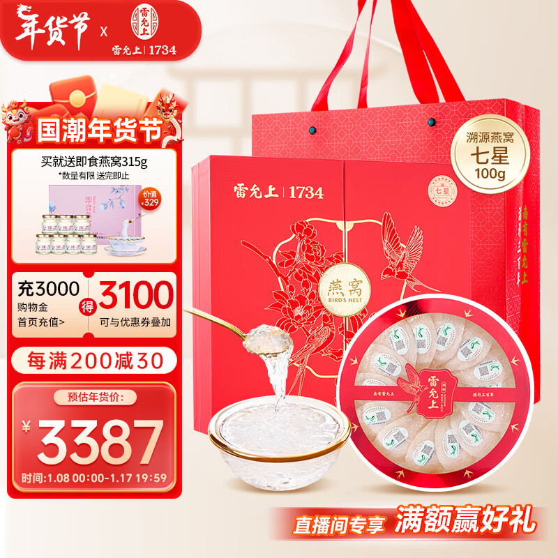 雷允上 燕窝100g 【7星】 马来西亚进口干盏燕盏干货礼盒孕妇补品孕期营养品春节年货礼盒价格:3957.00元!