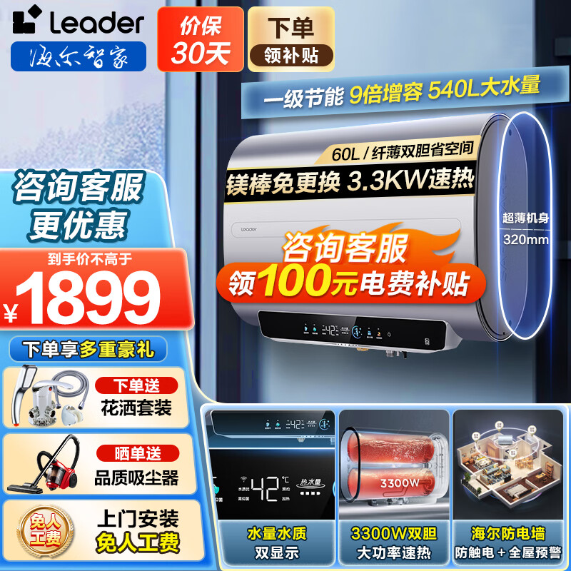 海尔(Haier)纤薄扁桶双胆60升家用电热水器3300W一级能效镁棒免更换水质水量双可视手机智控价格:1899.00元!