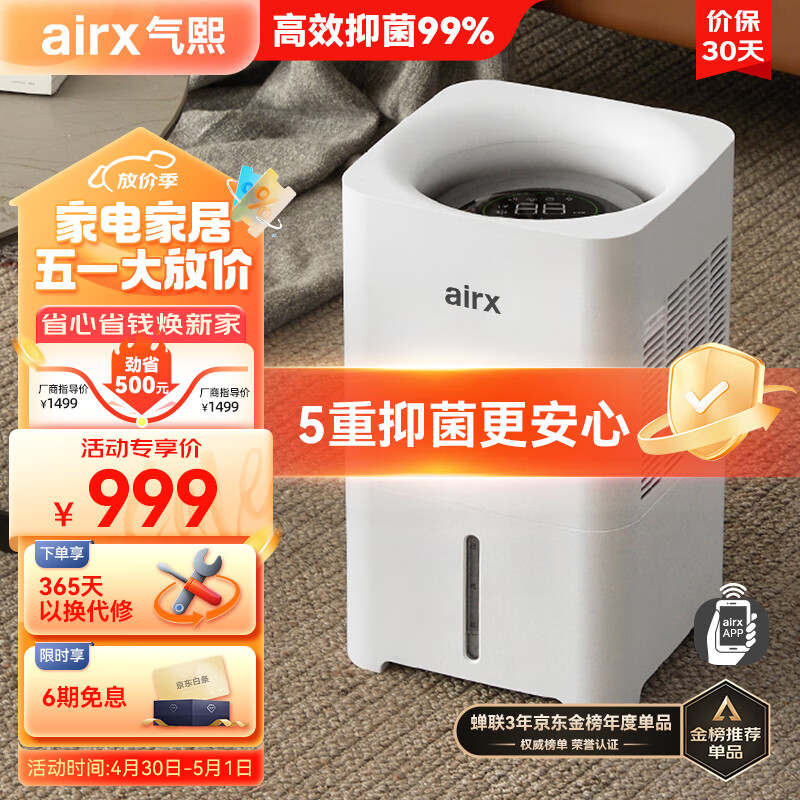airx气熙 高端无雾加湿器 卧室家用办公室孕妇婴儿空气加湿 6L大容量 上加水 母婴推荐800ml/h加湿量H8价格:1399.00元!
