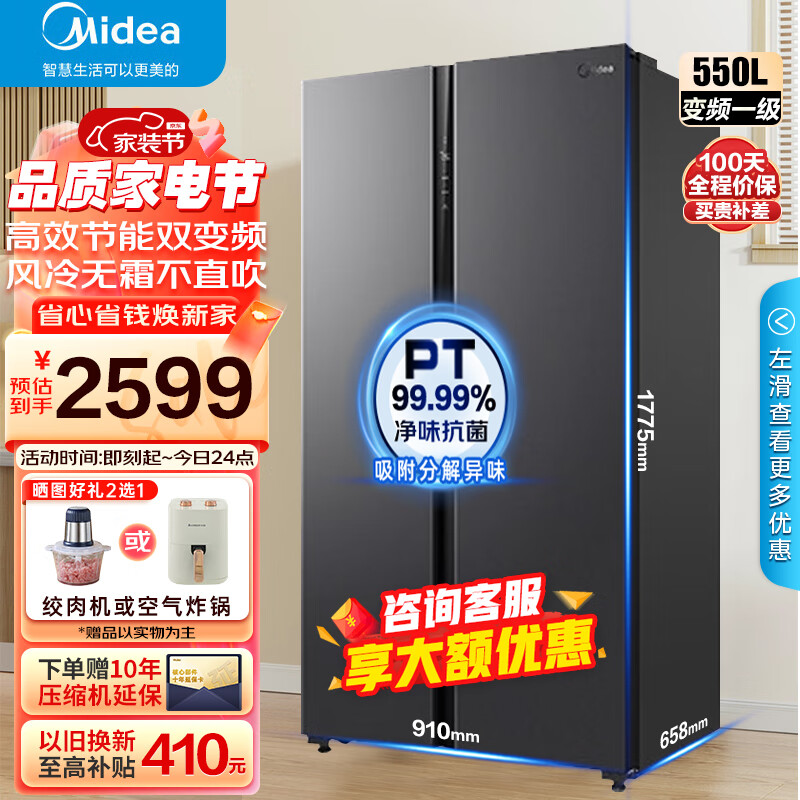 美的(Midea)550升一级能效双变频对开门双开门家用智能电冰箱节能无霜净味超薄嵌入BCD-550WKPZM(E)大容量价格:2998.00元!