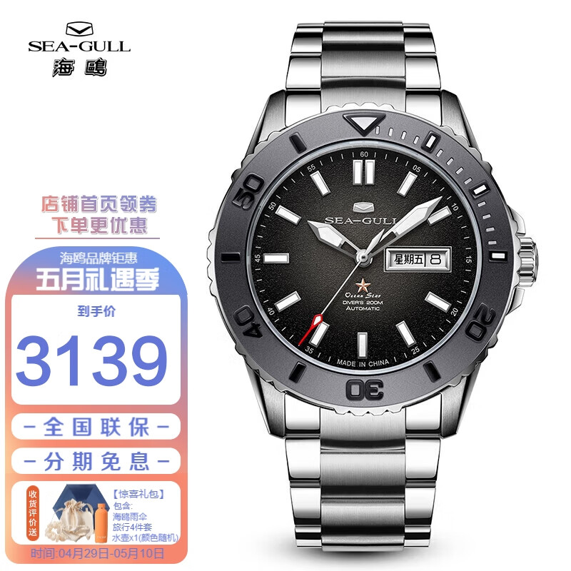 海鸥(SEAGULL)手表男士自动机械表 男表礼物 海洋之星200米防水潜水腕表 海鲨银价格:3619.00元!
