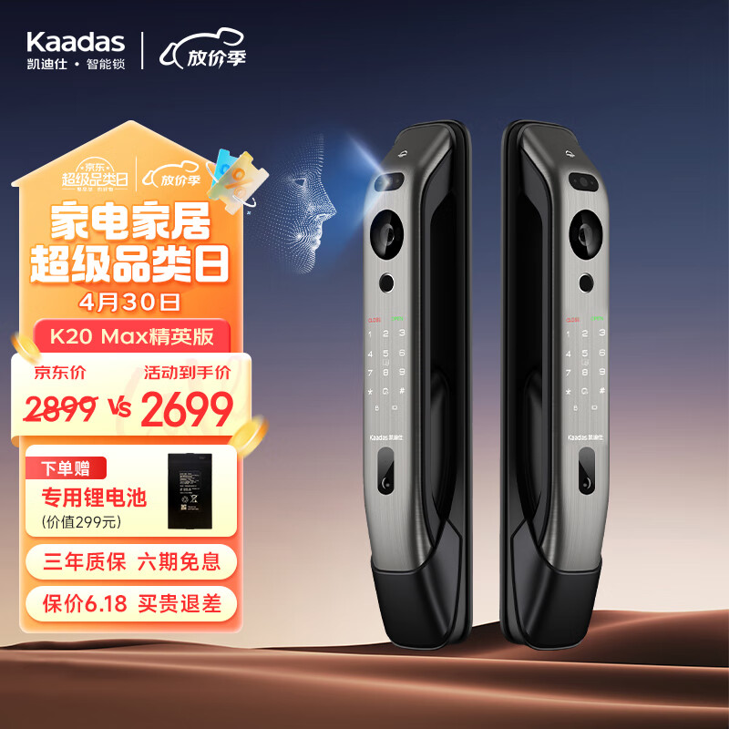 凯迪仕(kaadas)指纹锁全自动智能锁 智能猫眼人脸识别智能门锁 K20 Max精英版价格:2699.00元!