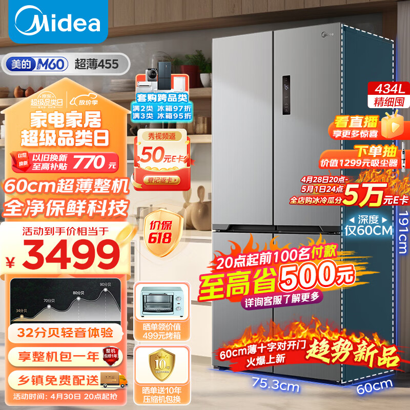 美的(Midea)M60系列60cm薄455流苏银十字双开门四开门一级变频风冷无霜智能家用大容量电冰箱MR-455WSPZE价格:3999.00元!