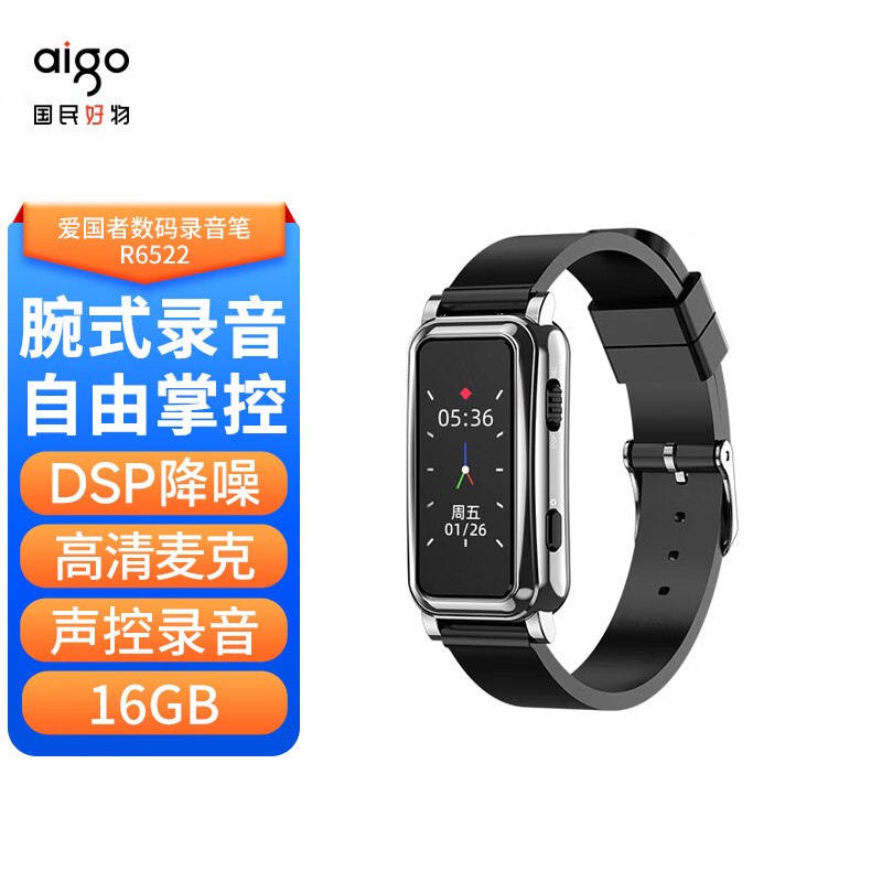 爱国者aigo手表手环式录音笔R6522 16G专业录音器一键录音高清降噪录音 MP3播放器 学习采访会议黑色价格:199.00元!