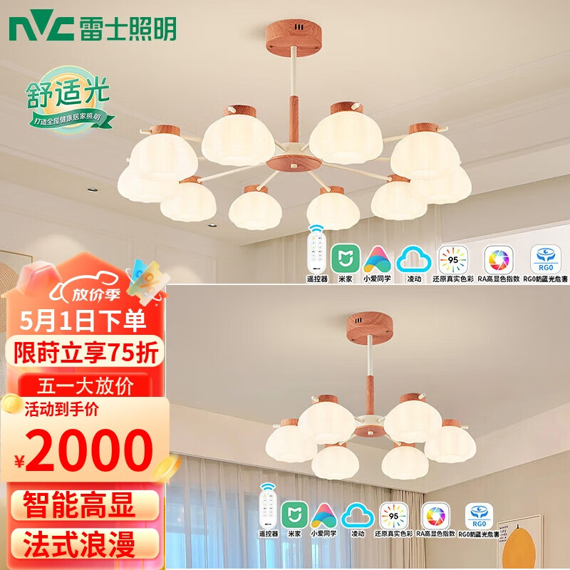 雷士(NVC)奶油风法式泡芙客厅餐厅吊灯智能高显10头一室一厅WHDD100F/G-05价格:2666.00元!