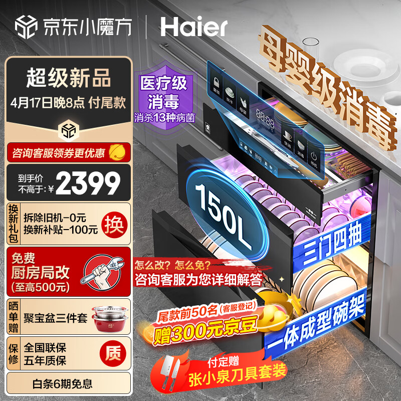 海尔(Haier)150L三门四抽大容量消毒 嵌入式 家用 母婴消毒柜 碗柜碗筷消毒 紫外线+光波巴氏纯物理消毒EB150价格:2399.00元!
