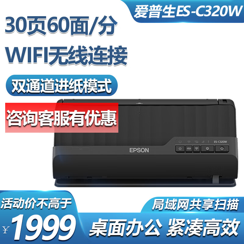 爱普生(EPSON)ES-C320W扫描仪WIFI无线连接A4紧凑型高速连续快速自动双面馈纸办公文档价格:1999.00元!
