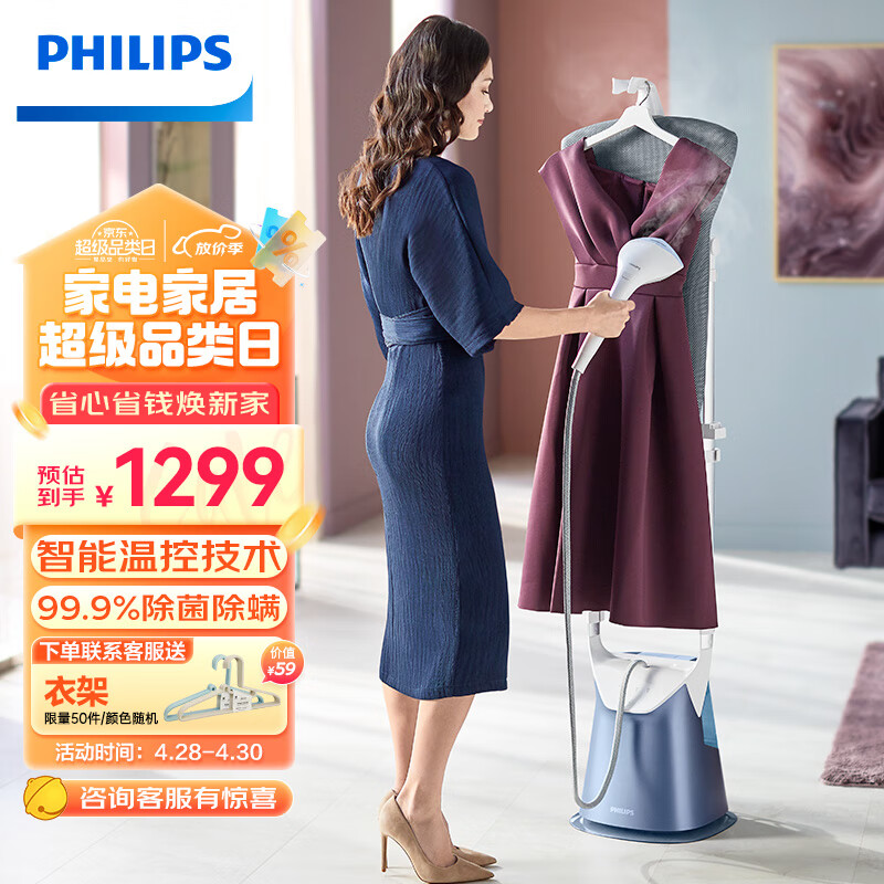 飞利浦 (PHILIPS) 蒸汽挂烫机熨烫机 家用 除菌除螨双杆带烫衣板 GC625/28价格:1443.00元!
