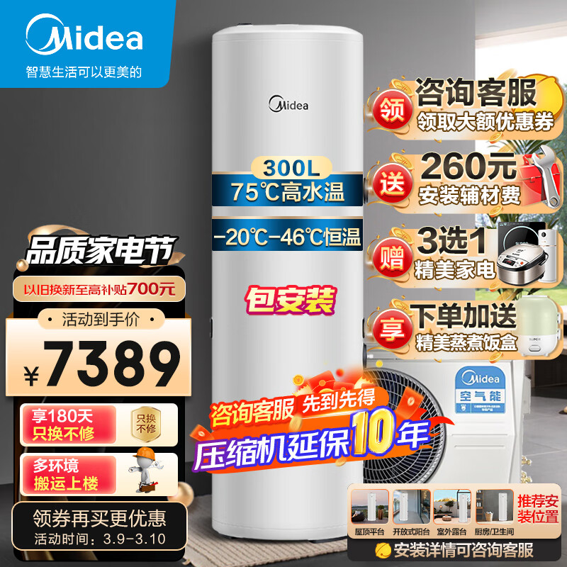 美的(Midea)空气能热水器家用300升包安装 水电分离电辅加热WiFi智控热水王KF109/RD-X2-300-(E3)(5-7人)价格:7699.00元!