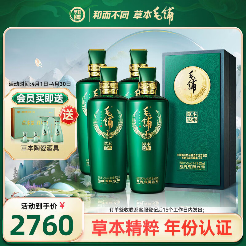 劲牌 毛铺苦荞酒 草本真年份 12年 52度 500ml*4瓶 整箱装价格:3029.00元!
