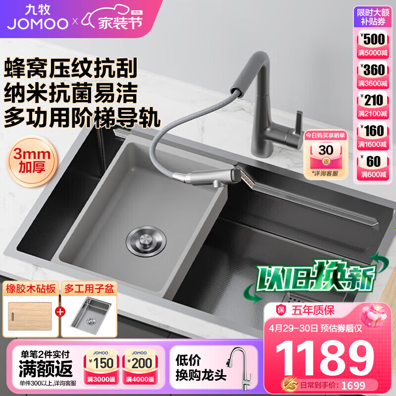 九牧(JOMOO)不锈钢压纹抗刮抗菌变轨水槽大单槽洗菜盆70*45不含龙头06283-9CZ价格:1499.00元!