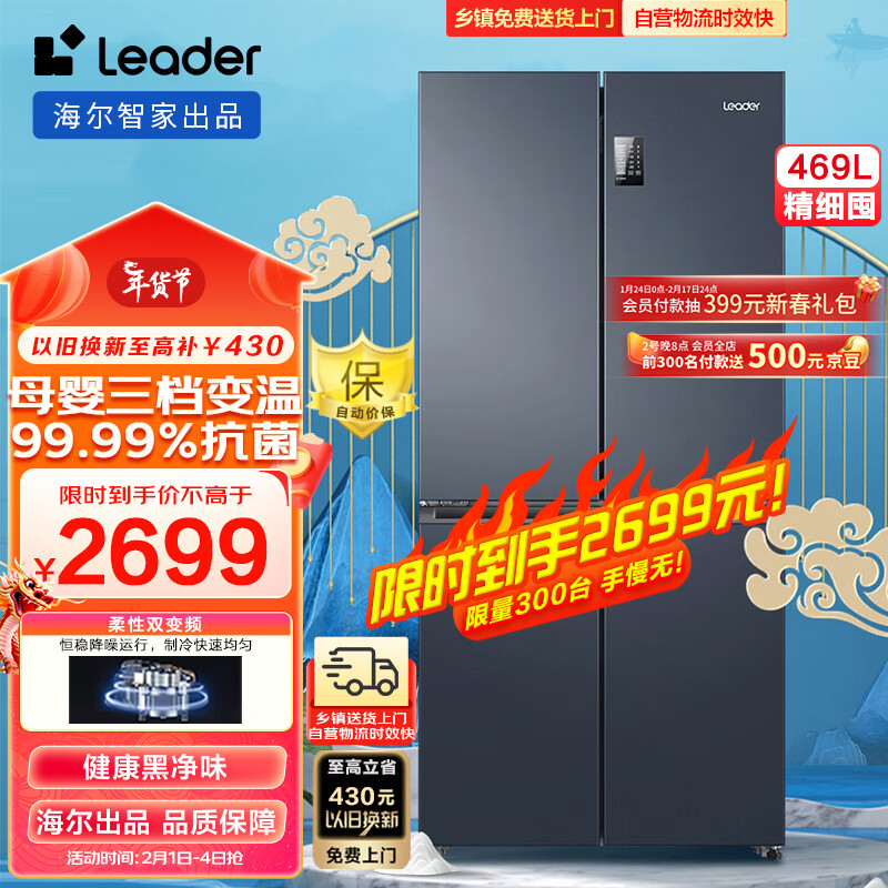 Leader 海尔智家出品469升一级能效大容量风冷无霜变温十字对开门四开门超薄家用电冰箱BCD-469WGLTDEDBX价格:2699.00元!