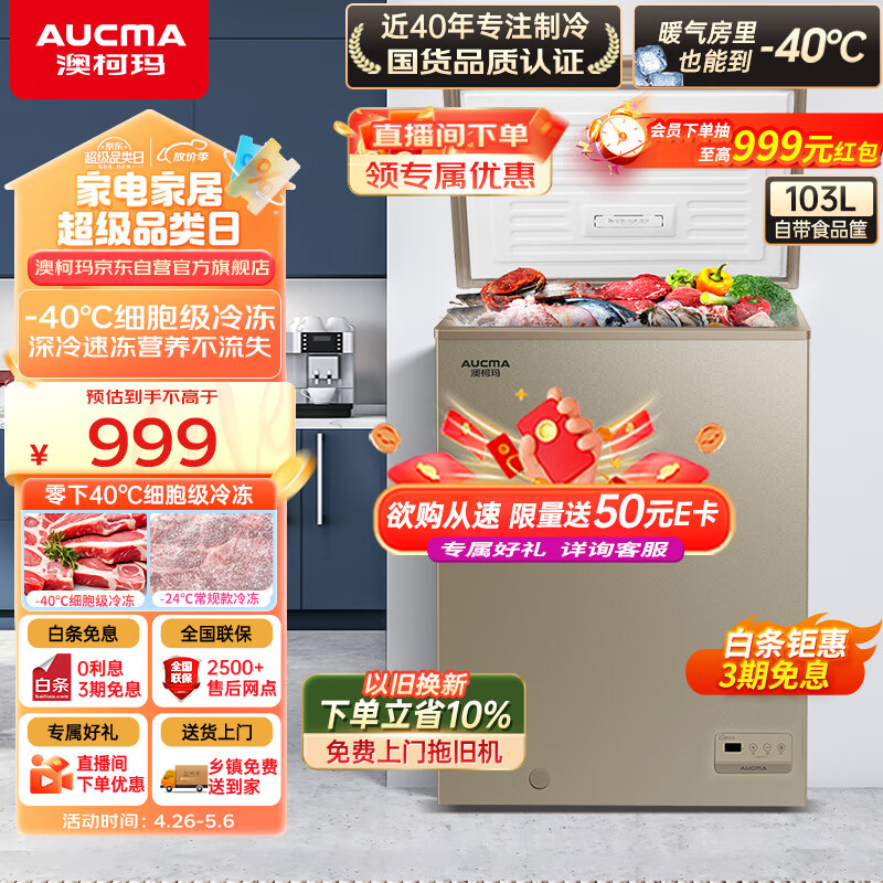 澳柯玛(AUCMA)103升零下40度超低温冰柜 囤货海鲜柜 电脑控温 家用商用小冷柜 一级能效 BC/BD-103FNE 以旧换新价格:1099.00元!