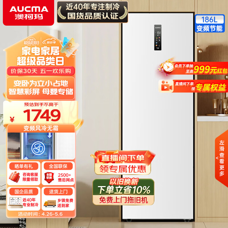澳柯玛(AUCMA)186升立式冰柜家用双变频风冷无霜 冻藏两用抽屉式冰柜 母乳小冷柜 以旧换新 星辉白 BD-186WPHNXI价格:1749.00元!