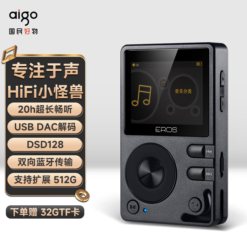 爱国者(aigo)EROS Q 蓝牙无损mp3音乐播放器 车载运动HIFI发烧DSD插卡迷你有屏学生随身听 灰色价格:649.00元!