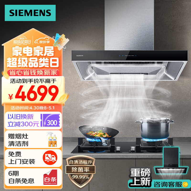 西门子(SIEMENS)抽油烟机灶具套装21.5m3/min 5D环吸油烟机 4.5kW燃气灶951W+GA23MP烟灶套装天然气以旧换新价格:4699.00元!