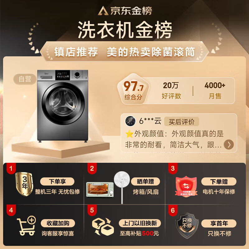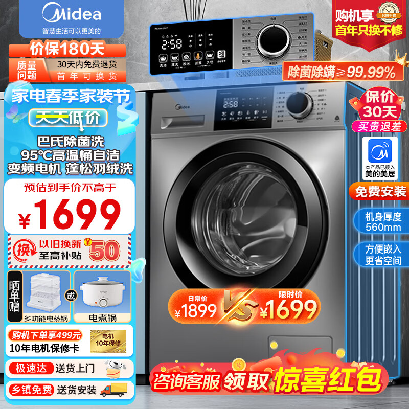 美的(Midea)滚筒洗衣机全自动洗脱一体10公斤家用大容量智控WIFI巴氏除菌变频电机羽绒服洗MG100VC133WY价格:1649.00元!