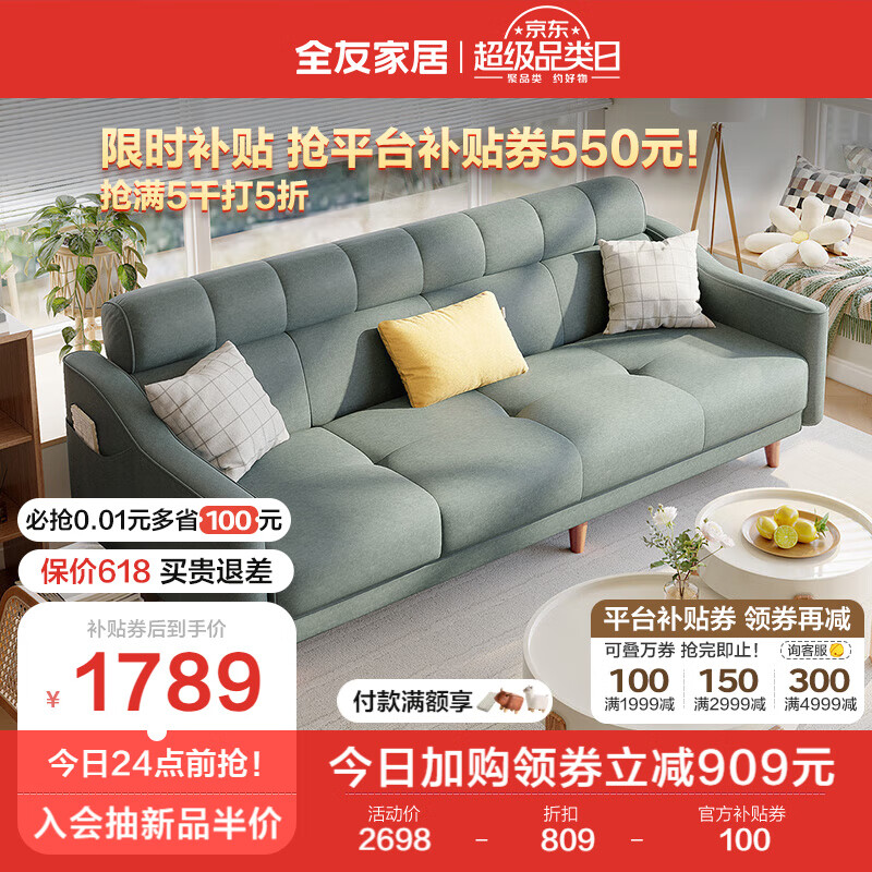 全友家居 北欧简约科技布艺沙发客厅三人位小户型可折叠沙发床102265价格:2698.57元!