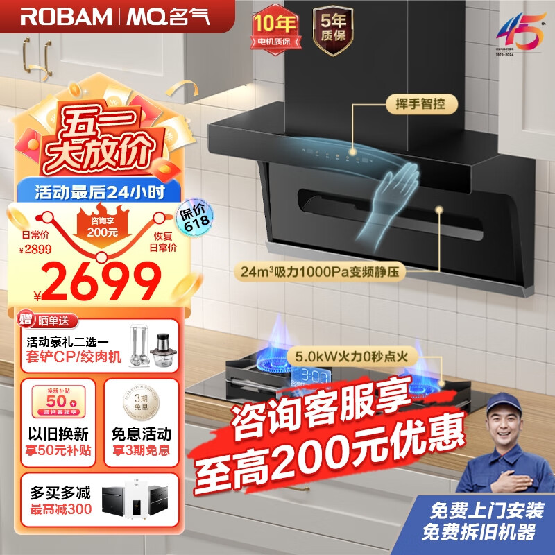 名气(MQ)老板抽油烟机7字型家用顶侧双吸变频油烟机家用24大吸力1000Pa变频烟灶套装双天然气A5508+A6820B价格:2899.00元!