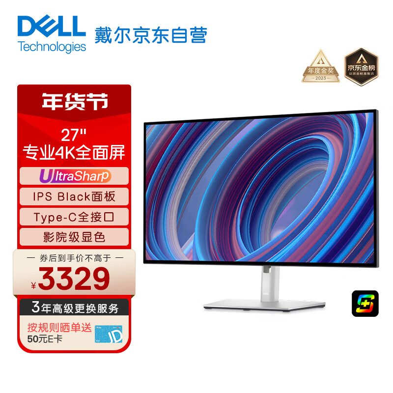 戴尔(DELL)UltraSharp 27英寸 4K显示器 IPS Black Type-C90W反向充电 防蓝光 U2723QX【金榜金奖】价格:3399.00元!