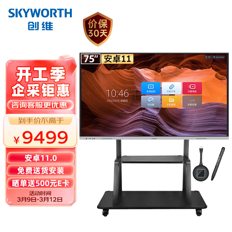 创维(Skyworth)会议平板75英寸 智能触摸一体机 电子白板 无线传屏投影 触屏电视 75DSH5投屏器推车【商用显示】价格:9499.00元!