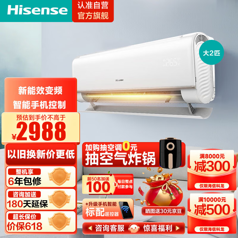 海信(Hisense)2匹 新能效 大风量速冷暖 APP智能变频防直吹两匹壁挂式客厅空调挂机KFR-50GW/E360-X3价格:2988.00元!